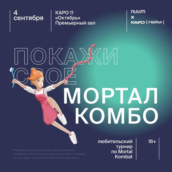 Москва, РФ — Финансовая платформа для геймеров NUUM, принадлежащая ПАО «МТС» (NYSE: MBT, MOEX: MTSS), ведущей российской компании по предоставлению цифровых, медийных и телекоммуникационных сервисов, и киносеть «КАРО» приглашают 4 сентября 2021 года на открытый финал турнира NUUM Saturday Session 2021. Финалисты сразятся в любительском файтинге по Mortal Kombat 11 на одном из самых больших экранов России. Для зрителей организаторы подготовили специальную программу: встреча с популярными блогерами из мира гейминга, фирменные бургеры, DJ сет, а также возможность сыграть на экране кинотеатра.