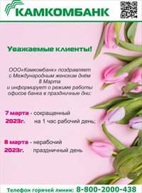 Режим работы офисов банка 7, 8 марта 2023г.
