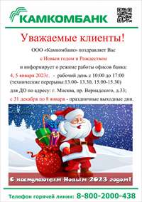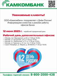 20.05.2023г. дополнительный офис ООО "Камкомбанк" по адресу: г. Набережные Челны, пр-кт Набережночелнинский, д. 7 по техническим причинам не будет осуществлять обслуживание клиентов.
