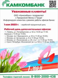 Режим работы офисов банка 1 мая 2023г.