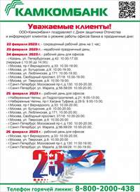 29.04.2023г. дополнительный офис ООО "Камкомбанк" по адресу: г. Набережные Челны, пр-кт Набережночелнинский, д. 7 по техничеким причинам не будет осуществлять обслуживание клиентов.