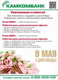 Режим работы офисов банка 8 и 9 мая 2023г.